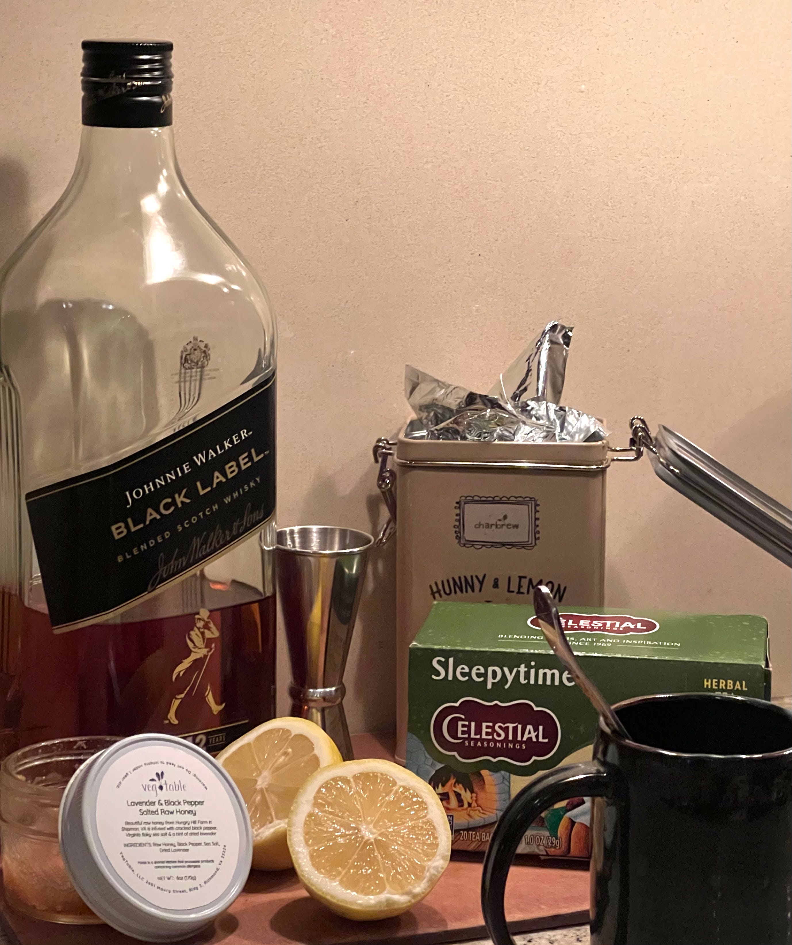 Specialty honey makes a wonderful holiday gift and this year brought me this honey from the vegetable.rva. This lavender and black pepper honey makes this a very special cocktail and I always eat a little straight from the jar before melting into the potion. I haven’t been to able to find this honey to purchase outside of occasional inventory at the Birdhouse Farmers Market, but the key is this—use the good honey. The raw, local, uncut medicine.
