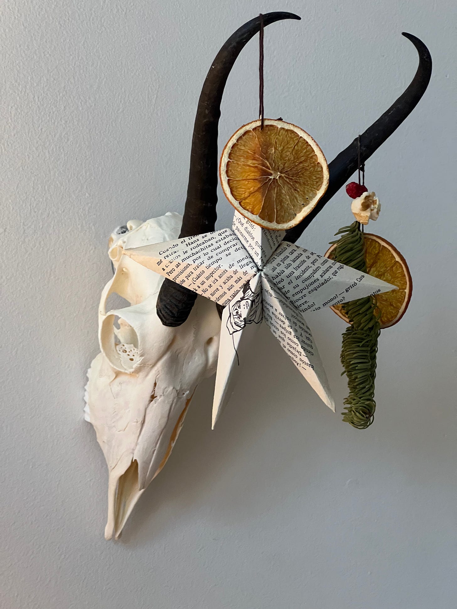 There were also beautiful yuletide garlands with paper stars and dehydrated oranges. I sat on the floor surrounded by twine and pine needles, poking holes in kernels of popcorn and cranberries. But too depressed to hang them, the garlands sat on the counter and cranberries rotted. I carved clove oranges and wrapped them with shiny ribbon. I crafted until my hip-bones hurt and the smell gave me a headache.