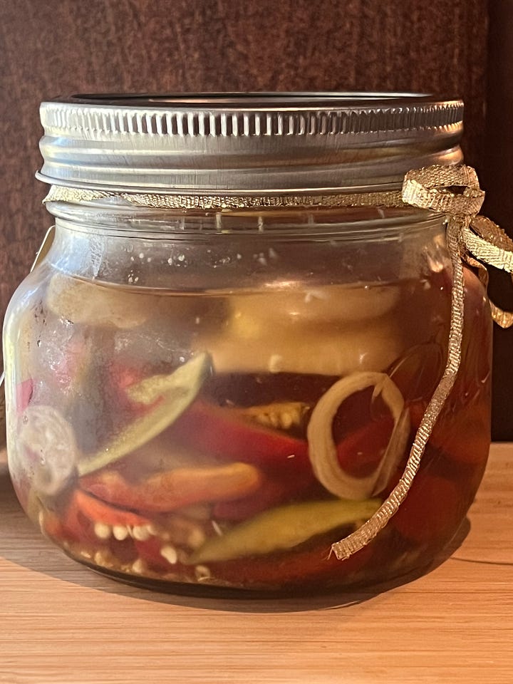 Spices are kind of free for all, there’s lots of variation you can choose from. I personally stick to a couple bayleaf, whole black peppercorn, 2 cloves of garlic, and 1 tsp mustard seed. Turmeric powder will dye your vegetables a vibrant yellow color if you want a classic gherkin look. Cinnamon and other warm spices like clove and allspice work really well with hardier roots like carrots or beets.