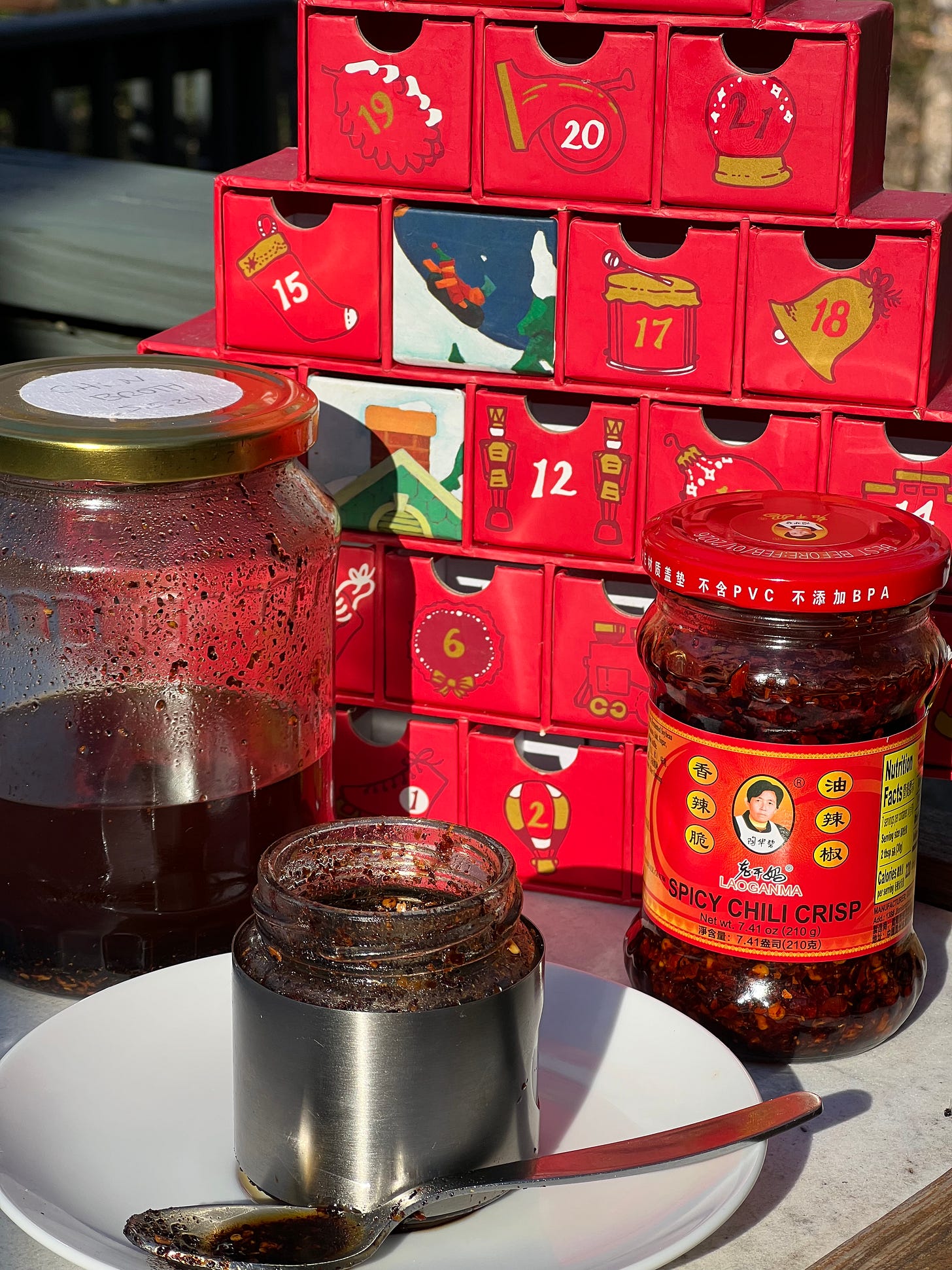 In terms of coping skills, I wasn’t expecting chili oil. It serves a purpose beyond just enticing you to the next bite. Feel it stimulate your senses back to life. Feel it wake your body up from a depressed state. Feel your face get hot and burn you into the moment. A good chili oil goes with almost anything. If I wake up stressed and in a ceaseless cycle of overthinking, I douse it over my eggs. The spice breaks me out of the cycle, the heat reminds me I am present in my body. If the day has lagged on and nothing is going my way, I melt cheese onto bread, and drizzle with chili oil. I suddenly have bigger problems than feeling petty disappointments. My tongue is on fire and I feel alive. Embrace the heat.